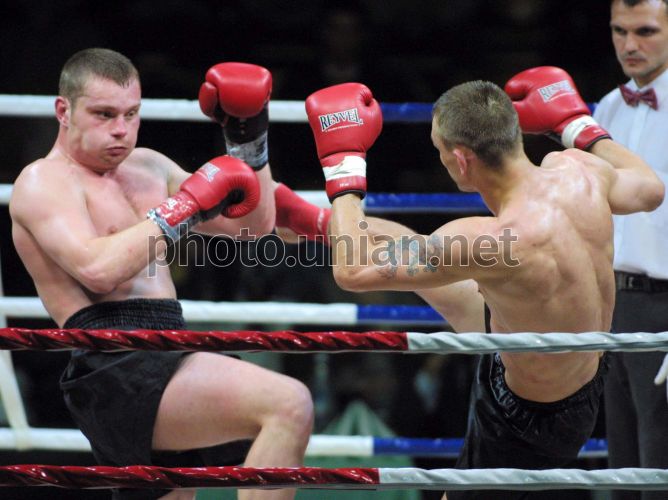 Andrey Kirsanov of Russia (28, 193cm, 95 kg), left, blocks the attack of Sergey Ivanovich of Byelorussia (193cm, 91 kg) during the qualification tournament “Kings of Ring” among the CIS states athletes of the super-heavy category, Kyiv’s Sports Palace, Saturday, May 4, 2002.