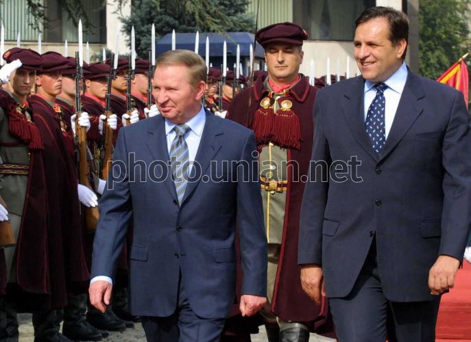 Ukrainian President Leonid Kuchma, left, accompanied by Macedonian President Boris Trajkovski goes past the Guards of Honour prior to the begining of negotiations in Macedonia's capital Skopje, on Tuesday, Oct. 22, 2002. Ukraine's President arrived in Macedonia for a two-day official visit.