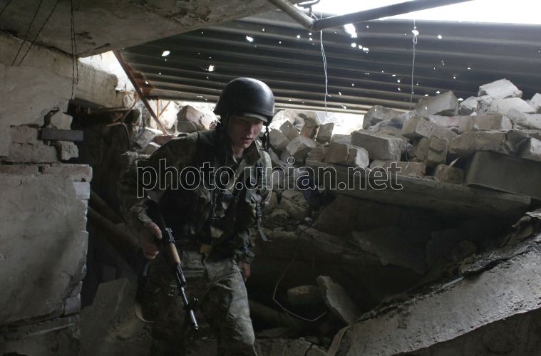 Ukrainian serviceman in a ruined house