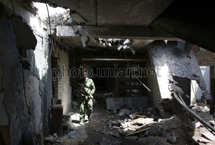 Ukrainian serviceman in a ruined house