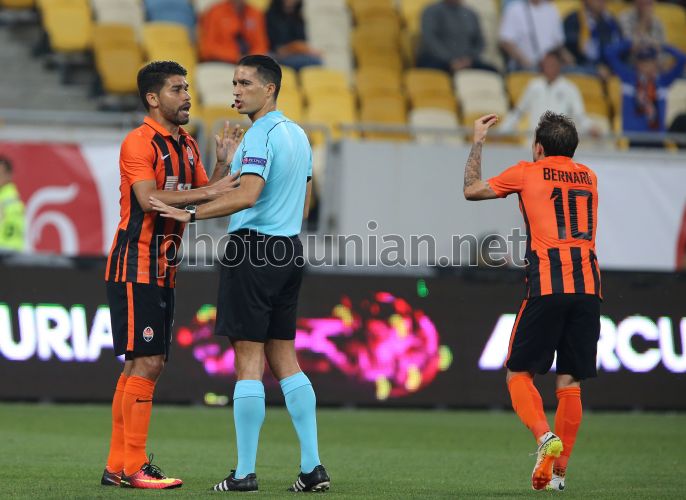 The players of FC "Shakhter" (Donetsk) rejoice goal scored