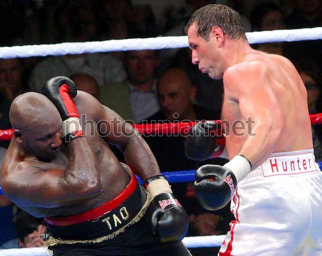 Julius Francis from Great Britain, left, blocks Vladimir Virchis' punch as they compete for IBF heavyweight champion title during the International box championship in Ukrainian capital Kiev on Sept. 6, 2003. Virchis won the fight.