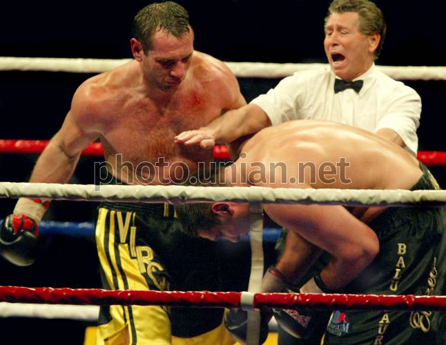 IBF version intercontinental heavyweight box champion Volodymyr Virchis from Ukraine, left, knocks out Balu Zauer (Zaur Abdulagamidov) from Germany during their International box championship fight for IBF champion title in Ukrainian capital Kiev on Saturday, Jan. 31, 2004.