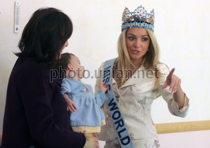 Chapter of organizational committee of competition "Miss of the World" Julia Morli, on the left, Miss World-2006 Tatyana Kukharzhova in orphanage "Berezka" in Kiev, On Tuesday, October 16th, 2007. On October 16th 2007 Tatyana Kukharzhova came to Kiev to participate in the fashion show of special collection "Love fashion AID", which was created by Ukrainian designers on the initiative of Fund "ANTIAIDS". Before the fashion show Tatyana Kukharzhova decided personally to talk to HIV-positive people and to learn more about the problem of HIV/Aids in Ukraine. Tatyana Kukharzhova, chapter of organizational committee of competition "Miss of the World" Julia Morli and founder of Fund "ANTIAIDS" Elena Franchuk visited an infectious clinic in Lavra and Kiev house of child "Berezka". Photo by Sergey Svetlitsky / UNIAN