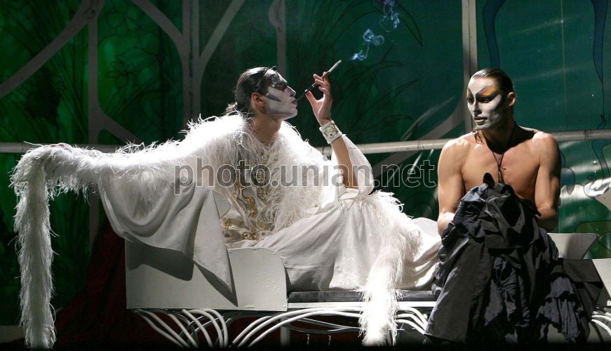 Actor Dmitry Zhoidik as Cleare, on the right, and actor Alexey Nesterenko as Madam in the staging of Jean Jean "Maids" in L'viv, on Thursday, October, 18th, 2007. Known work of Jean Jean Roman Viktyuk put his own way, originally and interesting. He considers that maids in performance of Jean Jean must be played by male actors. Photo UNIAN
