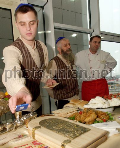 Workers of Jewish restaurant near the table with their products at the 3rd Kharkov championship of a culinary, pastry art and service in Kharkov on Thursday, November, 8th, 2007 Within the championship competitions passed on four nominations: cooks, pastry cooks, barmen and waiters. Photo by Vladimir Andreev / UNIAN