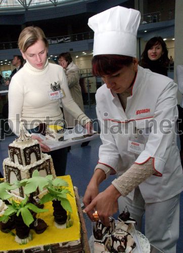 The pastry cook of one of the Kharkov supermarkets lays out the pieces of cake at the 3rd Kharkov championship of a culinary, pastry art and service in Kharkov on Thursday, November, 8th, 2007 Within the championship competitions passed on four nominations: cooks, pastry cooks, barmen and waiters. Photo by Vladimir Andreev / UNIAN