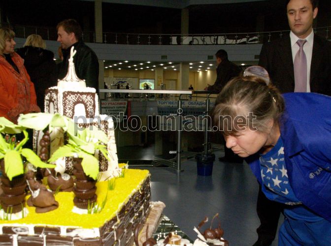 One of the visitors of the exhibition watching the cake at the 3rd Kharkov championship of a culinary, pastry art and service in Kharkov on Thursday, November, 8th, 2007 Within the championship competitions passed on four nominations: cooks, pastry cooks, barmen and waiters. Photo by Vladimir Andreev / UNIAN