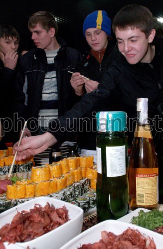 Visitors taking sushi at the 3rd Kharkov championship of a culinary, pastry art and service in Kharkov on Thursday, November, 8th, 2007 Within the championship competitions passed on four nominations: cooks, pastry cooks, barmen and waiters. Photo by Vladimir Andreev / UNIAN